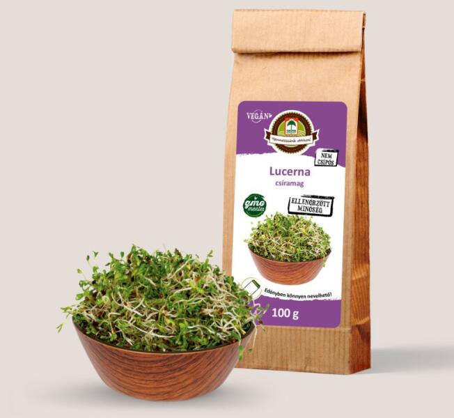 Lucerna csíramagLágy ízű, gyorsan fejlődő csíra, ami hamar kitölti az egész üveget. Salátás, semleges íze miatt bármilyen ízvilághoz passzol. Keverheted salátákba, teheted szendvicsekbe. Összetétel: lucerna Felhasználás: A magokat áztasd be tiszta vízbe legalább 8 órára mielőtt elkezdenéd a csíráztatást. A csírázás ideje alatt naponta legalább két alkalommal alaposan öblítsd át a növényeid. Fogyasztás előtt mindig alaposan mosd meg és szemrevételezéssel és szaglással is ellenőrizd, hogy nem romlottak meg. Kezdd a csíráztatást egy ablaktól távoleső, sötétebb helyen, majd az utolsó 1 napon tedd ki a fényre, hogy a levélkezdemények kizöldüljenek. Mindez az extra vitaminok és klorofill termelése miatt szükséges.