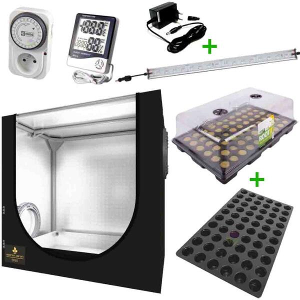 A legolcsóbb készlet a a palánták előnevelése, a magok csírázása vagy a termesztéshez mikrozöldségek. Ez egy teljes készlet azoknak, akik magról akarnak növényeket termeszteni, vagy azoknak, akik szeretnek vágni. A komplett készlet egy szaporítóból, világításból, időzítőből és egy kis üvegházból áll. Minden, amire szüksége van egy termékben, csak öntöznie kell.